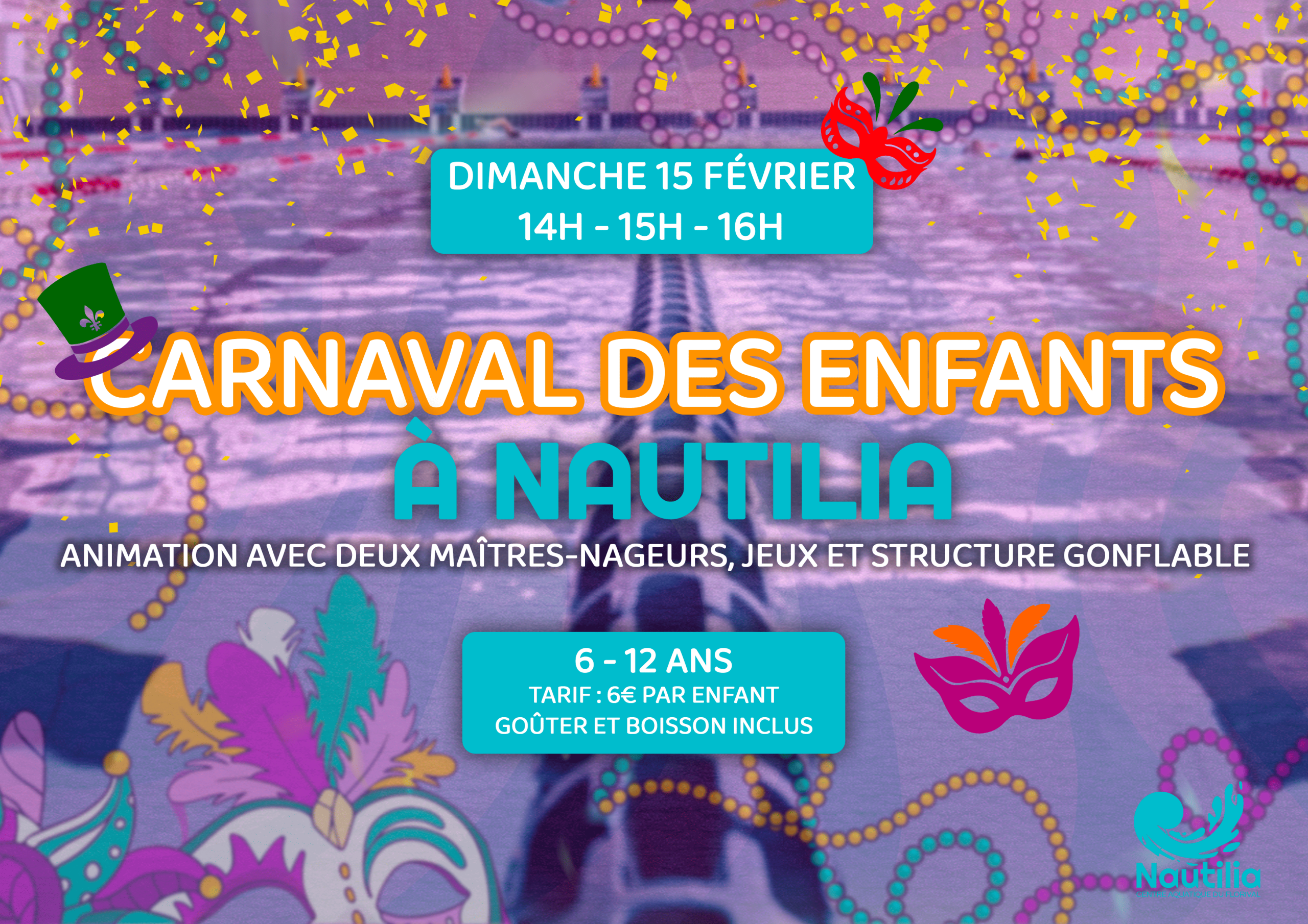 Rendez-vous le Dimanche 15 Février pour le carnaval des enfants sur 3 séances 14h00-15h00 et 16h00. Alors, inscrivez-vous vite !!!!